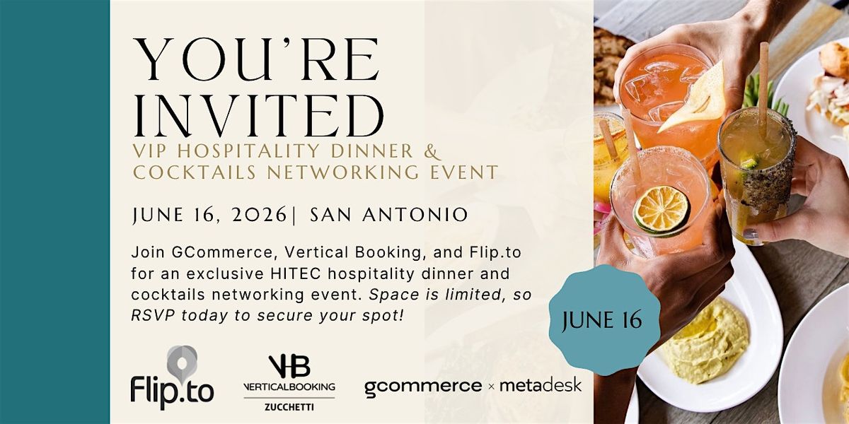HITEC is coming up, and we're excited to connect with our fellow hospitality leaders. GCommerce along with Vertical Booking and Flip.to are hosting cocktails and dinner immediately following the conference on Tuesday, June 16 at Anaqua Garden Bar + Corinne.