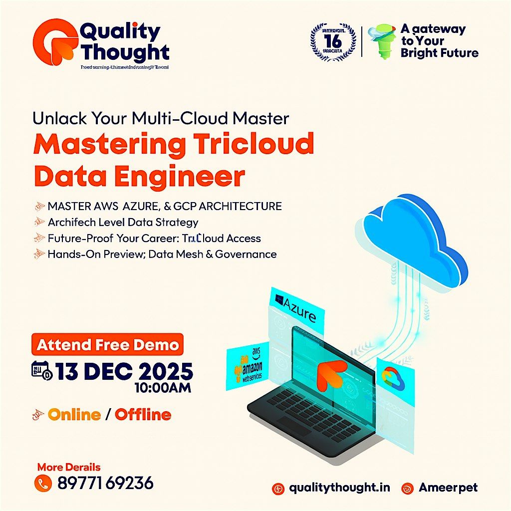 Welcome to the , , Data Engineering event happening at Quality Thought on January 20, 2026 at 10:00 AM (Asia/Kolkata). Get ready to dive deep into the world of cloud data engineering with experts in the field. Whether you're a beginner or an experienced professional, this event is perfect for anyone looking to expand their knowledge and network with like-minded individuals. Don't miss out on this exciting opportunity to learn and grow in the ever-evolving tech industry!