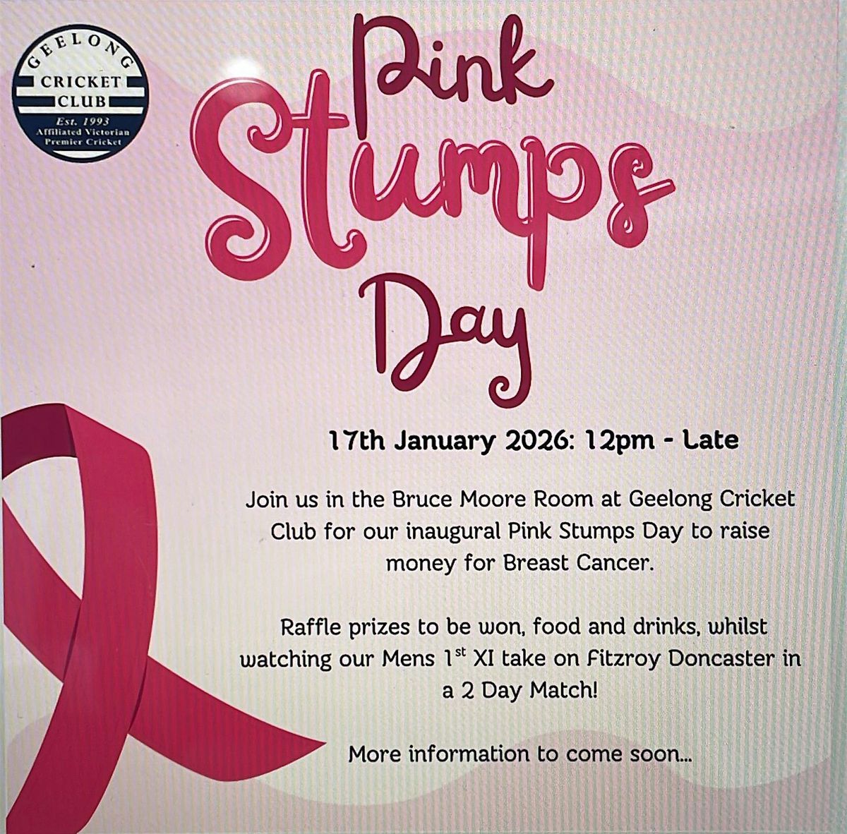 Join us at the Bruce Moore room for Pink Stumps Day. Tickets include welcome drink, nibbles & raffle prizes! Please wear a touch of pink