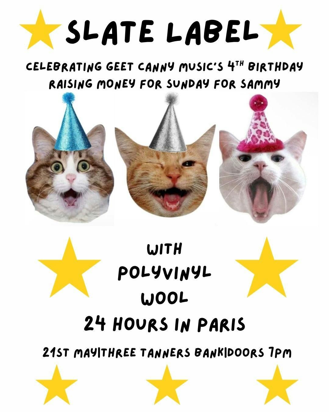 Celebrating our 4th birthday we're throwing a party (gig) and you're all invited to help us raise money for local charity Sunday For Sammy with PAYF ticket prices. We've got a packed lineup with 4 local bands: 24 Hours In Paris, Wool, Polyvinyl and closing the night Slate Label. Join us at Three Tanners Bank on May 21st to help us celebrate local creatives! See you down the front:))