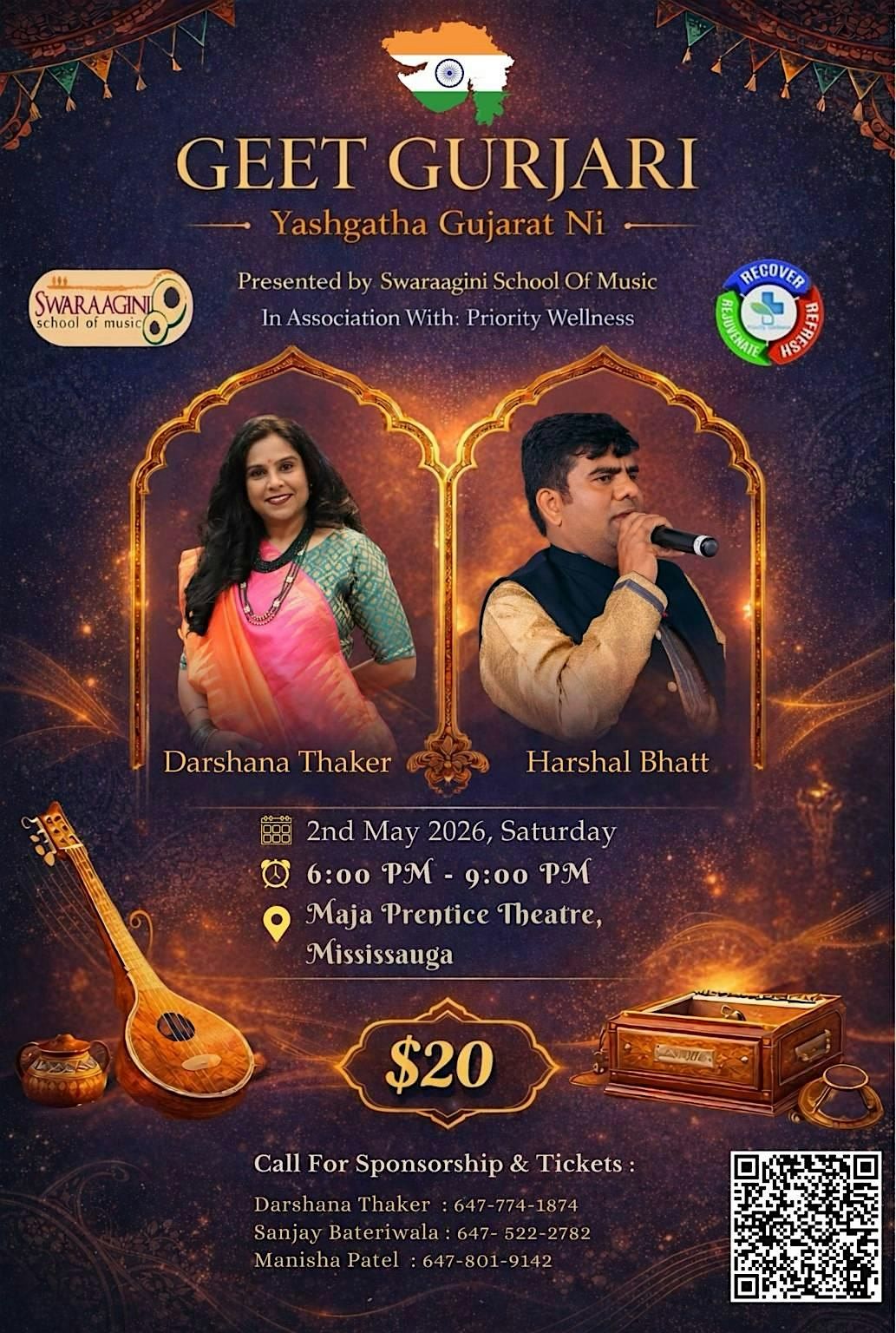 Join us for a special Gujarat Day celebration featuring GTA’s renowned sister-brother duo Darshana Thaker and Harshal Bhatt, as they bring to life the rich musical heritage of Gujarat.