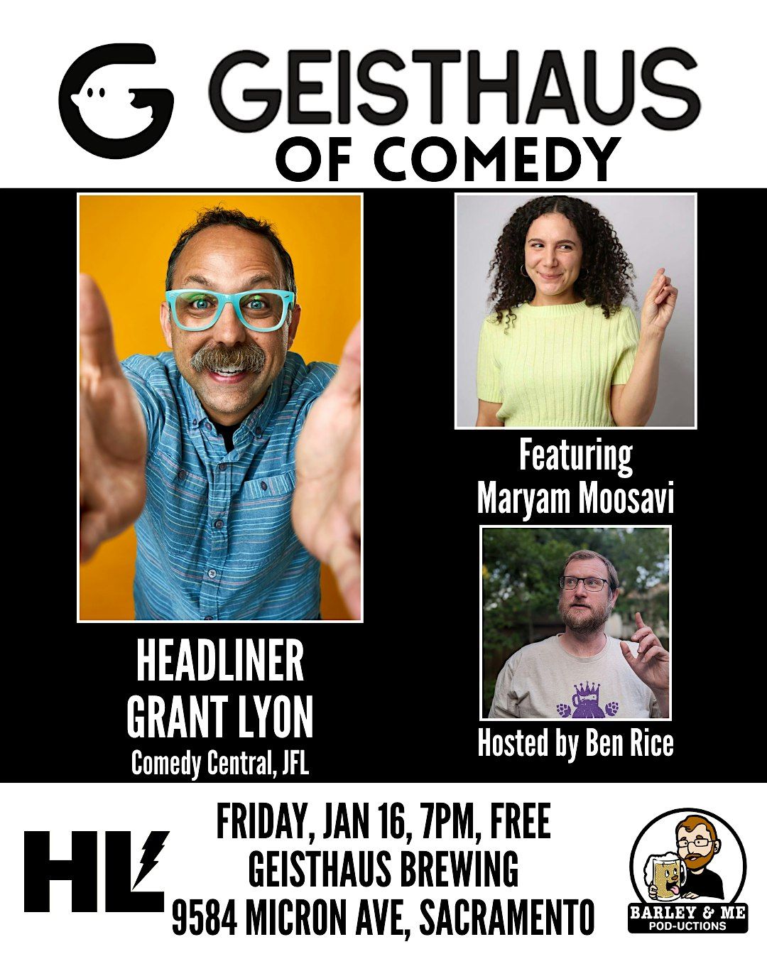 Headliner Grant Lyon (Comedy Central, Just For Laughs, board game creator & reviewer), featuring Sacramenot legend in the making Maryam Moosavi. Hosted by Ben Rice. Presented by Barley & Me Pod-uctions & Hyper Live Events.