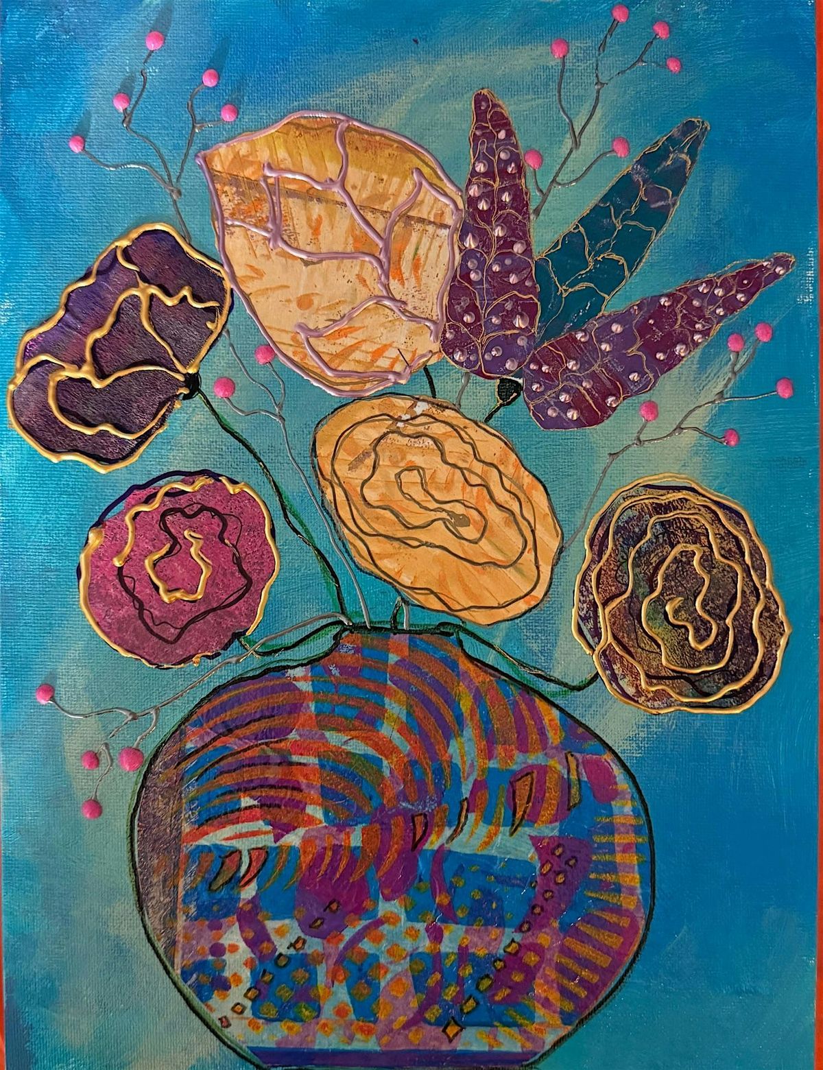 Students will have the option to make their own Gelli prints or choose from a selection of prints provided by the instructor. We’ll explore layering, cutting, and assembling prints to design whimsical vases and bold, expressive flowers. Add your own flair with drawing, painting, and embellishments to make your collage truly one-of-a-kind.