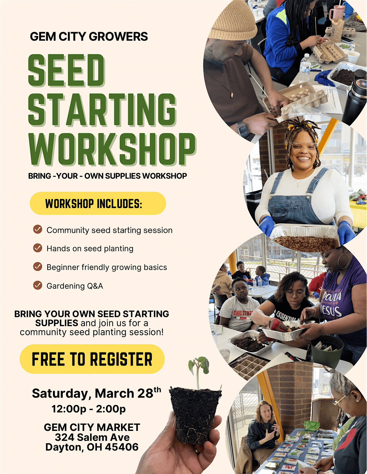 Join us for our FREE beginner friendly seed starting workshop where we will gather as a community to plant and grow together 🪴 This bring your own supplies session includes a guided presentation covering the basics of growing, seed starting techniques, and group seed planting session 🌱 Participants will start seeds alongside others in a relaxed, communal environment while learning practical gardening skills you can use at home 👩🏽🌾