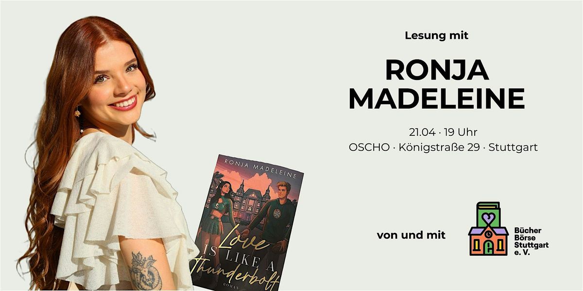 Die Bücher Börse Stuttgart lädt zu einer besonderen Lesung mit Ronja Madeleine ein, moderiert von Panagiotis Marinoglou. Erlebt die Geschichte von „Love is Like a Thunderbolt“ hautnah – ein Roman voller Gefühle, überraschender Wendungen und Momenten, die unter die Haut gehen.