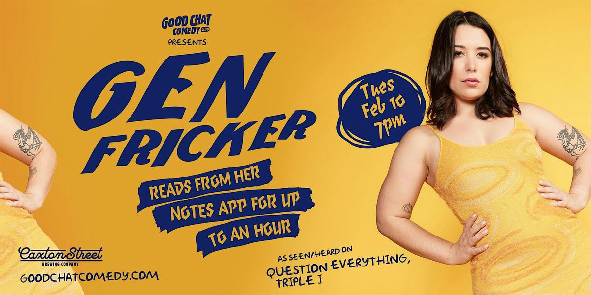 Join the crew at Good Chat Comedy Club for a work in progress hour with Australian comedy favourite, Gen Fricker!About this Event