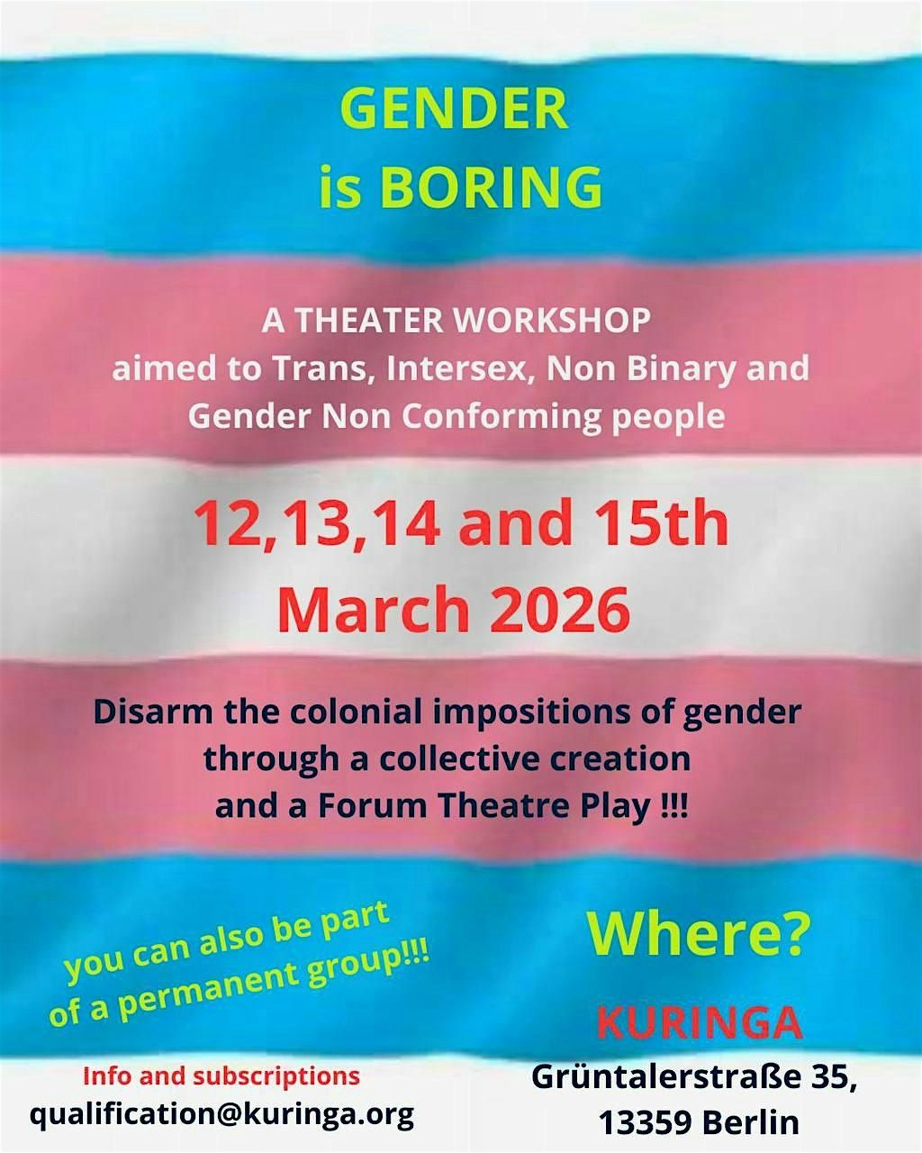 “Gender Is Boring” is a collective theatre process that examines the oppressive structures that confine gender to two fixed tracks. Through shared creation and Theatre of the Oppressed exercises, participants identify lived oppressions, personal and collective resources, and practical strategies to disarm colonial gender impositions and resist cis-normativity.