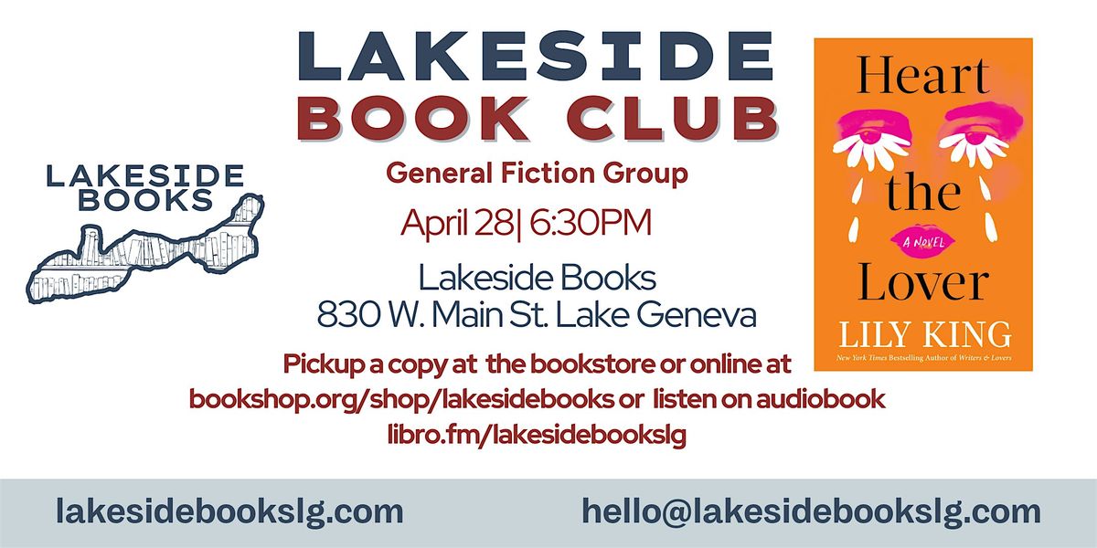 Our next book club read is Heart the Lover! Purchase books at the bookstore or online at bookshop.org/shop/lakesidebooks or listen on audiobook libro.fm/lakesidebookslg. Please RSVP so we have an accurate headcount. Please also join our Facebook Group for updates.