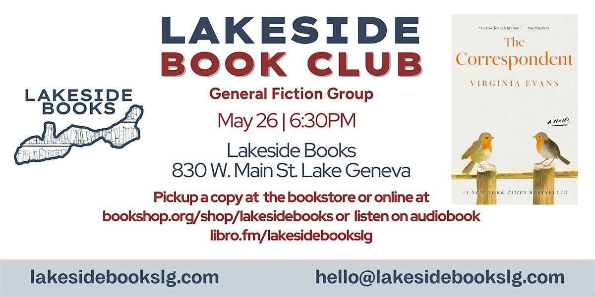 Our next book club read is The Correspondent! Purchase books at the bookstore or online at bookshop.org/shop/lakesidebooks or listen on audiobook libro.fm/lakesidebookslg. Please RSVP so we have an accurate headcount. Please also join our Facebook Group for updates.