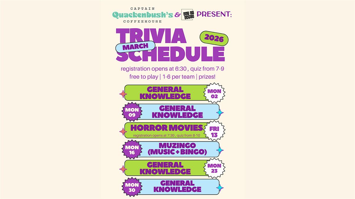 Come join us at Captain Quackenbush's Coffeehouse for a fun-filled evening of trivia! Test your knowledge on all things while enjoying delicious coffee, snacks and cocktails! Gather your friends and form a team to compete against others for the title of trivia champions. See you there!