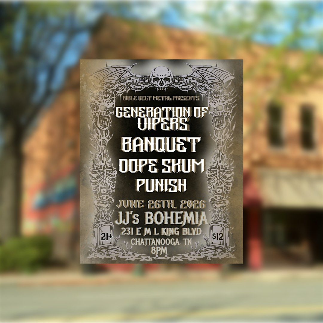 Come rage out with Generation of Vipers, Banquet, Dope Skum, and Punish at JJ’s Bohemia in downtown Chattanooga, TN.About this Event