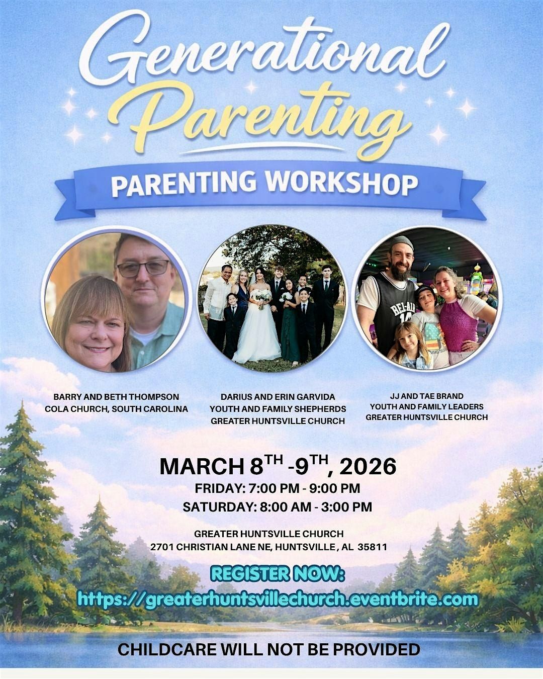 Join us at Greater Huntsville Church on May 8, 2026 at 7:00 PM - 9:00 pm and May 9, 2026 at 8:00 am - 3:00 pm (Central Time) for a fun and relaxed workshop all about parenting across generations. Whether you're a new parent, part of the sandwich generation caregiver, an empty nester, or simply looking for more parenting ideas, this event is ideal for sharing your stories. Ask questions and gain insights from expert parents experienced in private and public school education and Children's Ministry. Join us to discover fresh ideas, connect with parents who have similar experiences, and learn fun ways to engage with your kids and family!
