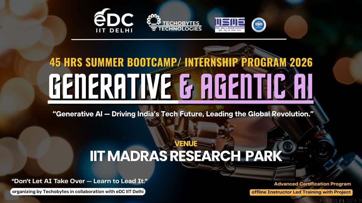About the Event40-HOUR SUMMER BOOTCAMP/INTERNSHIP PROGRAM 2026 WITH PROJECT AT IIT MADRAS RESEARCH PARK BY TECHOBYTES IN COLLABORATION WITH EDC IIT DELHI About TechobytesTechobytes Technologies is recognised as a leading expert in the design and delivery of technical, soft and hard skills training from individual courses and seminars to certification programs and full-scale training solutions, from classroom training to online training.Duration: The event is scheduled for 6 consecutive days, from 15th June 2026 to 20th June 2026.The training will include 40 hours of intensive learning with a project, covering concepts from basic to advanced level.Note: Candidates opting for the offline course in Chennai will also receive access to one complimentary 40 HRS online course of their choice.Benefits and certification:- 40 hours certification/internship program.- 3 certificates in each training. (Participation Certificate + 1 Bootcamp/ Internship Certificate with + Project Completion Certificate)- Updated industry-equipped curriculum.- Work on live projects.- Hands-on training by certified trainers from the industry.- Complimentary resume and CV building session.- Get an opportunity to attend a technical workshop from Techobytes in IIT’s.Generative & Agentic AI – 40 Hours Intensive Training ProgramMode: Hands-on Training + ProjectLevel: Beginner to AdvancedThis program is designed to provide comprehensive training in Generative AI, Large Language Models, and Agentic AI systems, enabling participants to build real-world AI applications used in modern industries.Tools & Technologies CoveredOpenAI APILangChain FrameworkHugging Face TransformersLangGraphFAISS Vector DatabaseChromaDBPython & AI LibrariesStreamlit DeploymentGit & GitHubCareer OpportunitiesParticipants can pursue career roles including:Generative AI EngineerLLM EngineerAI Agent DeveloperMachine Learning EngineerAI Application DeveloperAI Research EngineerData ScientistGet an immersive learning experience. Sessions will be led by industry experts, offering hands-on practicals and a cutting-edge curriculum aligned with industry standards.By attending, you'll not only gain valuable tech knowledge but also have the opportunity to network with industry professionals and connect with fellow participants, expanding both your skills and your professional circle.Thanks and regards,Techobytes Technologies