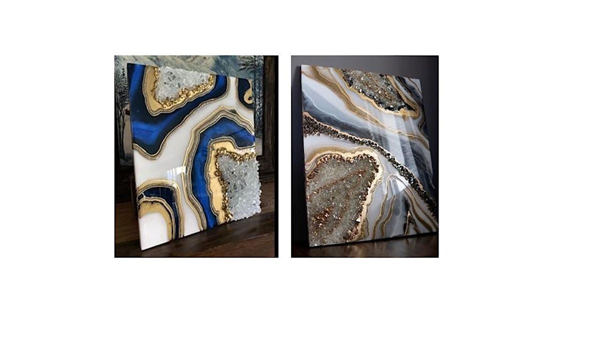 We will begin by painting our board, then we will add crushed glass and stones to create our design, then we mix our resin and colors and let our art come to life!
