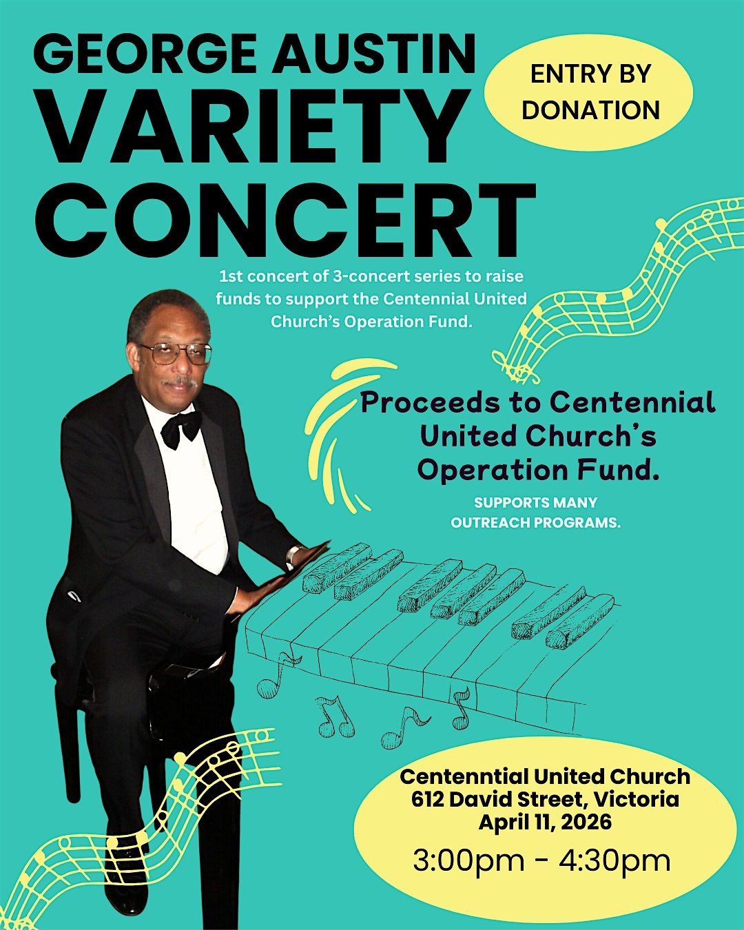 Enjoy a rich mix of musical styles in an intimate and welcoming setting, featuring the talent and artistry of George Austin. This concert is more than just a performance—it’s an opportunity to come together as a community and support a meaningful cause.
