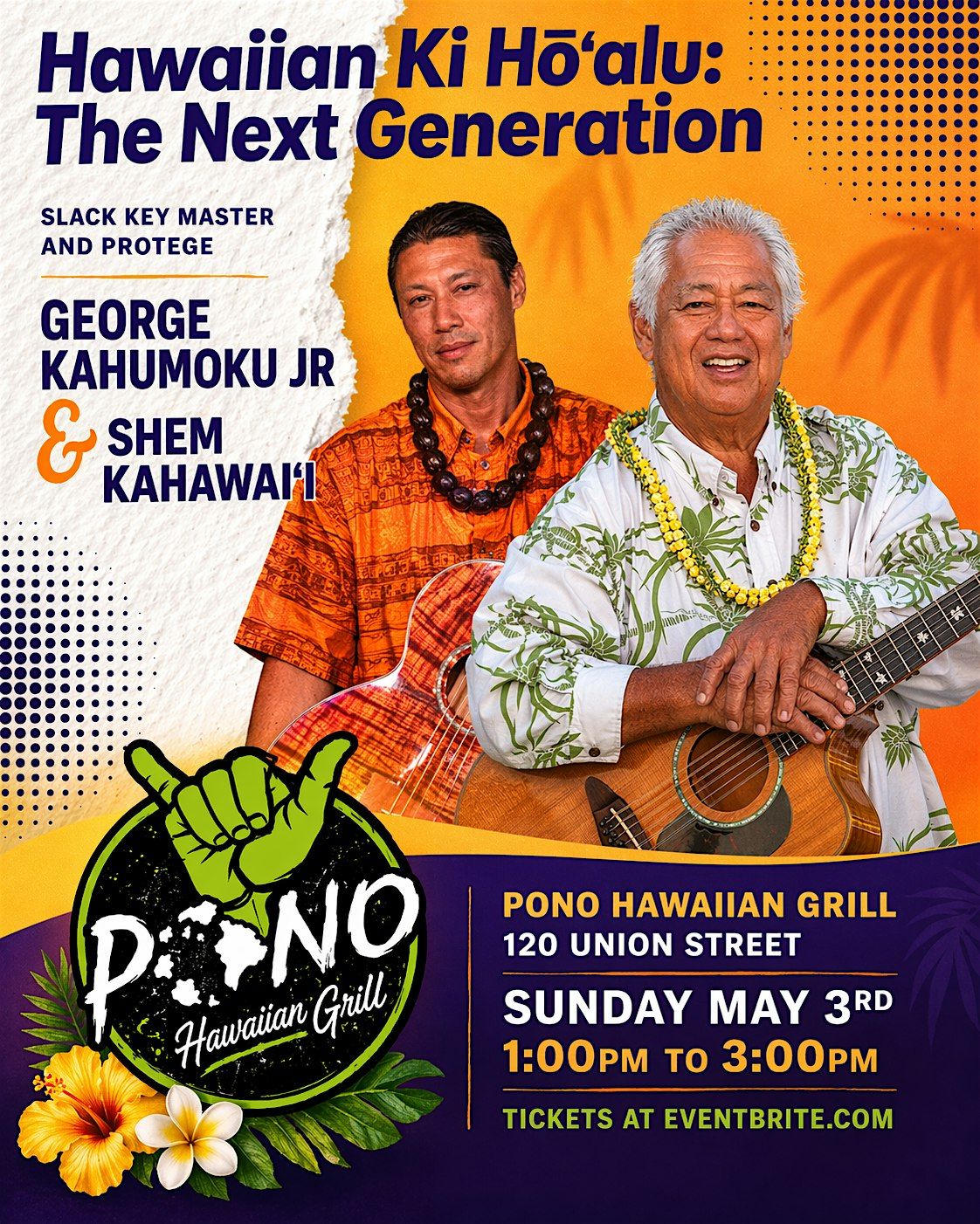 Join four-time Grammy Award winner George Kahumoku Jr. for an intimate afternoon of music and "talk story" as he introduces his protege, Shem Kahawaii, to California. As George—a master of the Hawaiian slack key guitar—relocates to the Santa Cruz area, he passes the torch to Shem, the talented young artist now hosting the famed Slack Key Show - Masters of Hawaiian Music located on Maui. Experience the rich cultural heritage of Hawaiʻi in this rare California appearance by two generations of slack key guitar.