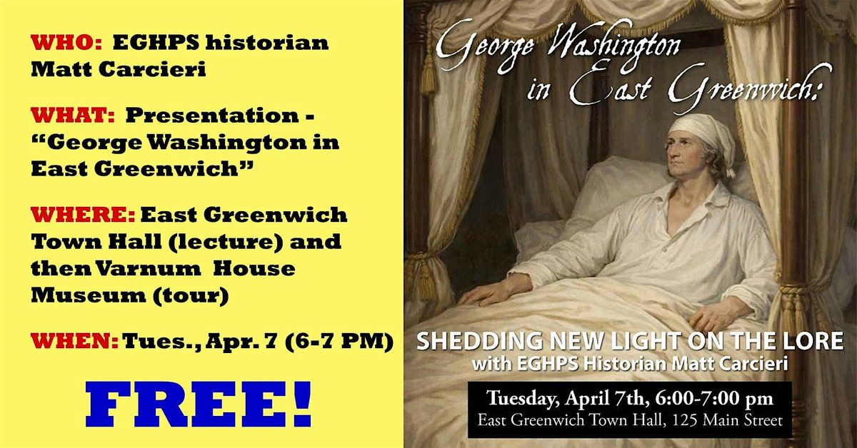 This event starts at East Greenwich (EG) Town Hall at 6:00 PM. After Matt Carcierie's presentation, attendees are invited to visit the Varnum House Museum (directly behind EG Town Hall) to visit to the bedroom where Washington purportedly slept and tour the museum.