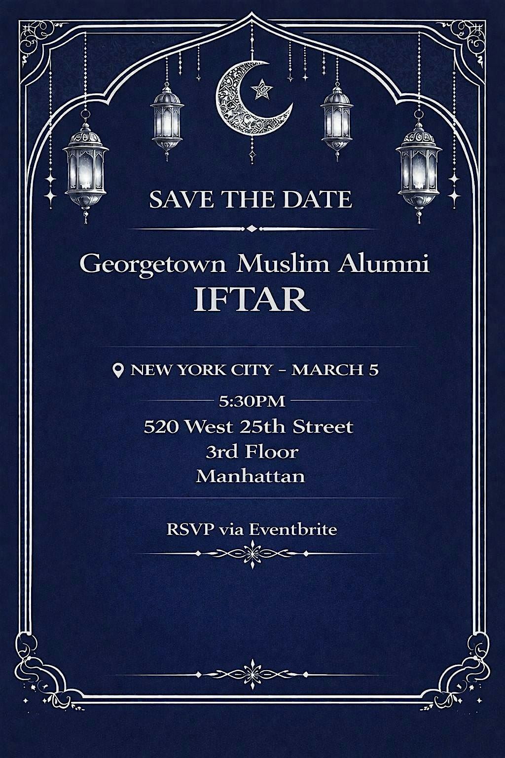 Come join us for a memorable evening at our Georgetown Alumni Iftar event in New York! Connect with fellow alumni, share stories, and enjoy delicious food together. Let's celebrate the spirit of community and togetherness during this special time. Don't miss out on this opportunity to reunite with old friends and make new connections. We can't wait to see you there!