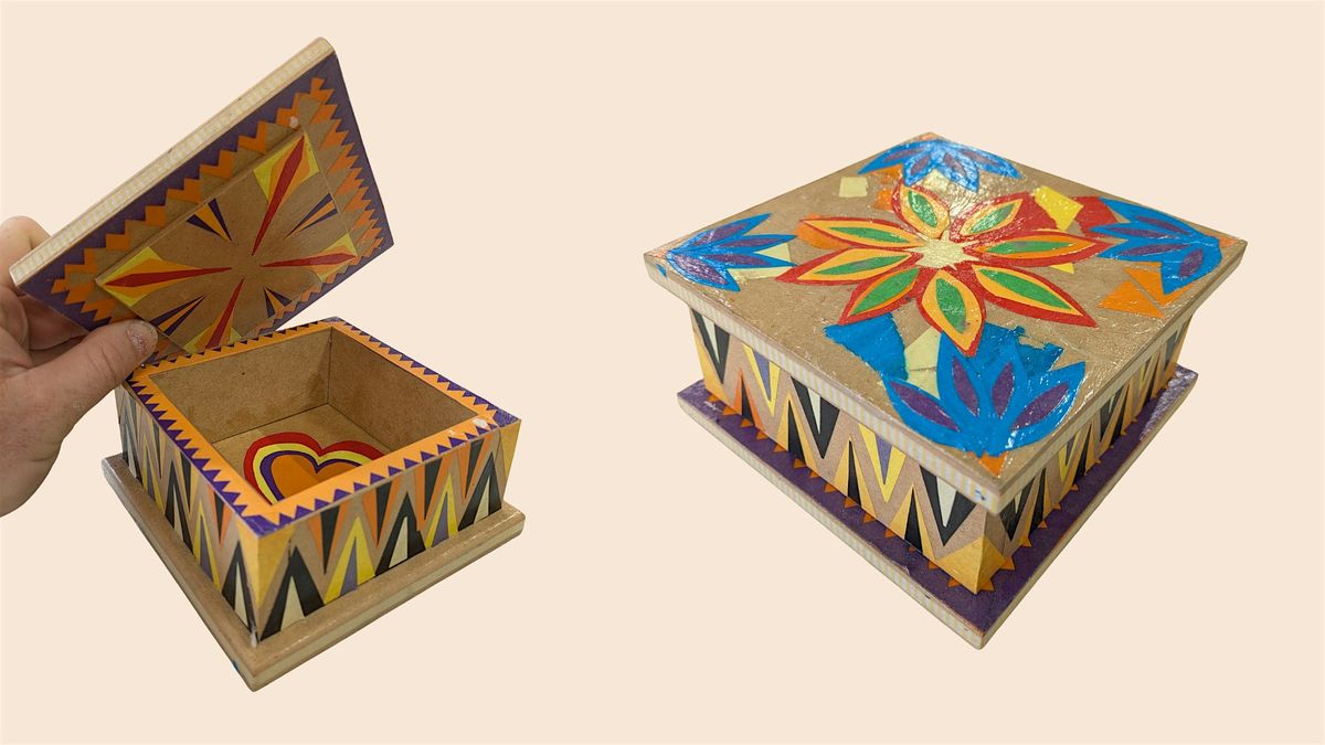 Decorate a timber craft box by using Mod Podge to glue colourful paper cutouts, then varnishing for a beautiful finish perfect for home décor.