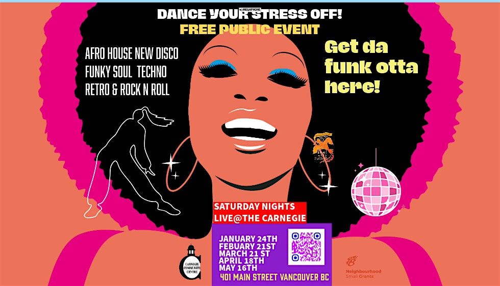 Ready to cut loose and show off your moves? Join us in person for Get Da Funk Outta Here! Get da Funk Outta Here! is a free and dry community dance event open to all ages. (18 and under should be accompanied by a legal guardian or parent). Come dance to the curated sounds of DJ Maxi from the Pigeon Den Art Collective. We are thankfully supported by funds from the Small Neighbourhood Grants and, in partnership with Carnegie Community Centre, the City of Vancouver. The event is at Carnegie Theatre and is wheelchair accessible, with gender-neutral washrooms. Come and dance your stress off and be home at a decent hour to boot.