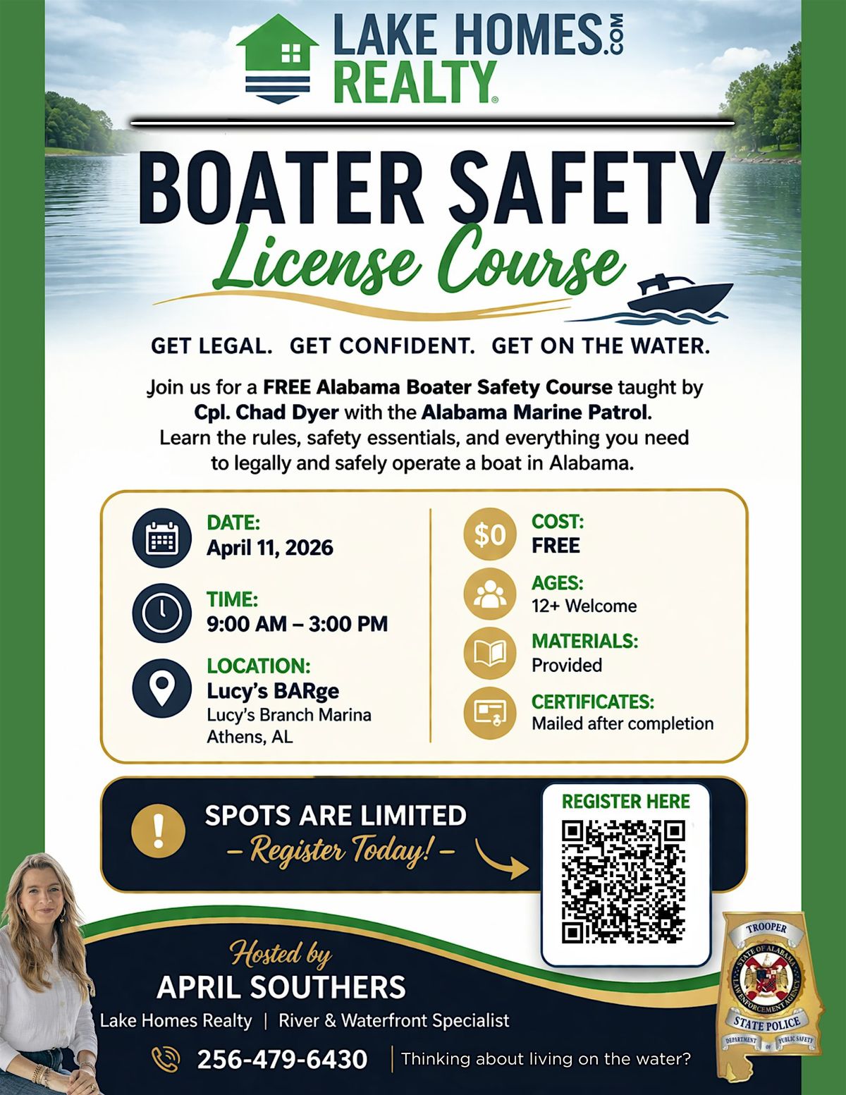 Join us for a FREE Alabama Boater Safety License Course at Lucy’s BARge at Lucy’s Branch Marina on Saturday April 11 from 9:00 AM to 3:00 PM.