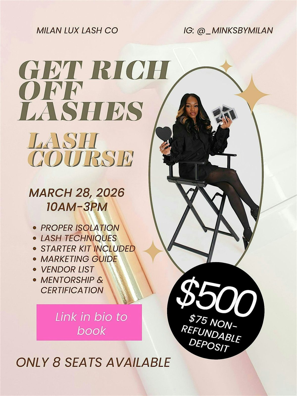 Welcome to Get Rich Off Lashes — a certification course designed to equip aspiring beauty professionals with the knowledge, technique, and confidence needed to become successful, professional lash technicians. The purpose of this class is not only to teach lash application, but to build a complete service provider who understands both artistry and professionalism. Throughout this training you will develop essential skills including, but not limited to, customer service, sanitation and safety, proper use of lash tools, lash anatomy, lash sets, diameters and lengths, lash baths, application and taping methods, lash styles, lash fills, safe removal techniques, and retention and aftercare. By the end of this course, students will be prepared to safely perform lash services, provide a high-quality client experience, and begin building a profitable and sustainable lash business.
