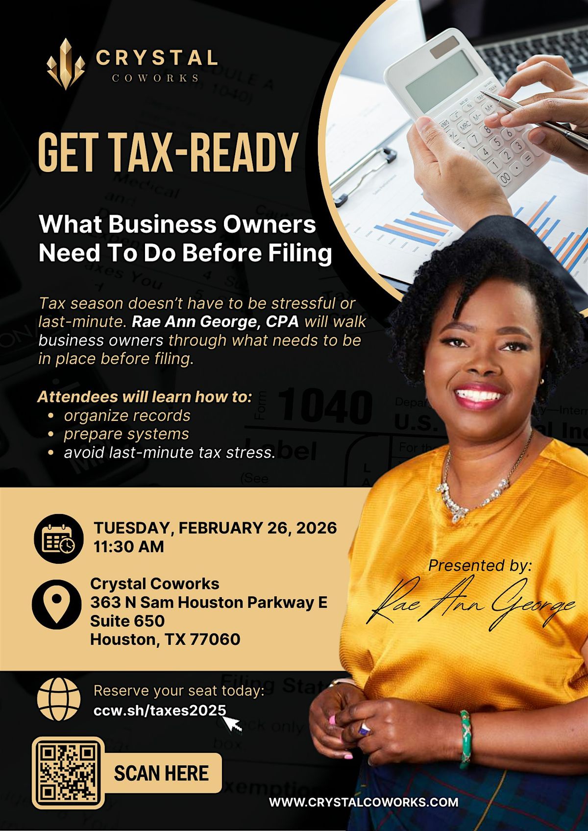 During this practical session, Rae Ann George, CPA will walk business owners through what needs to be in place before filing. Attendees will learn how to organize records, prepare systems, and avoid last-minute tax stress.
