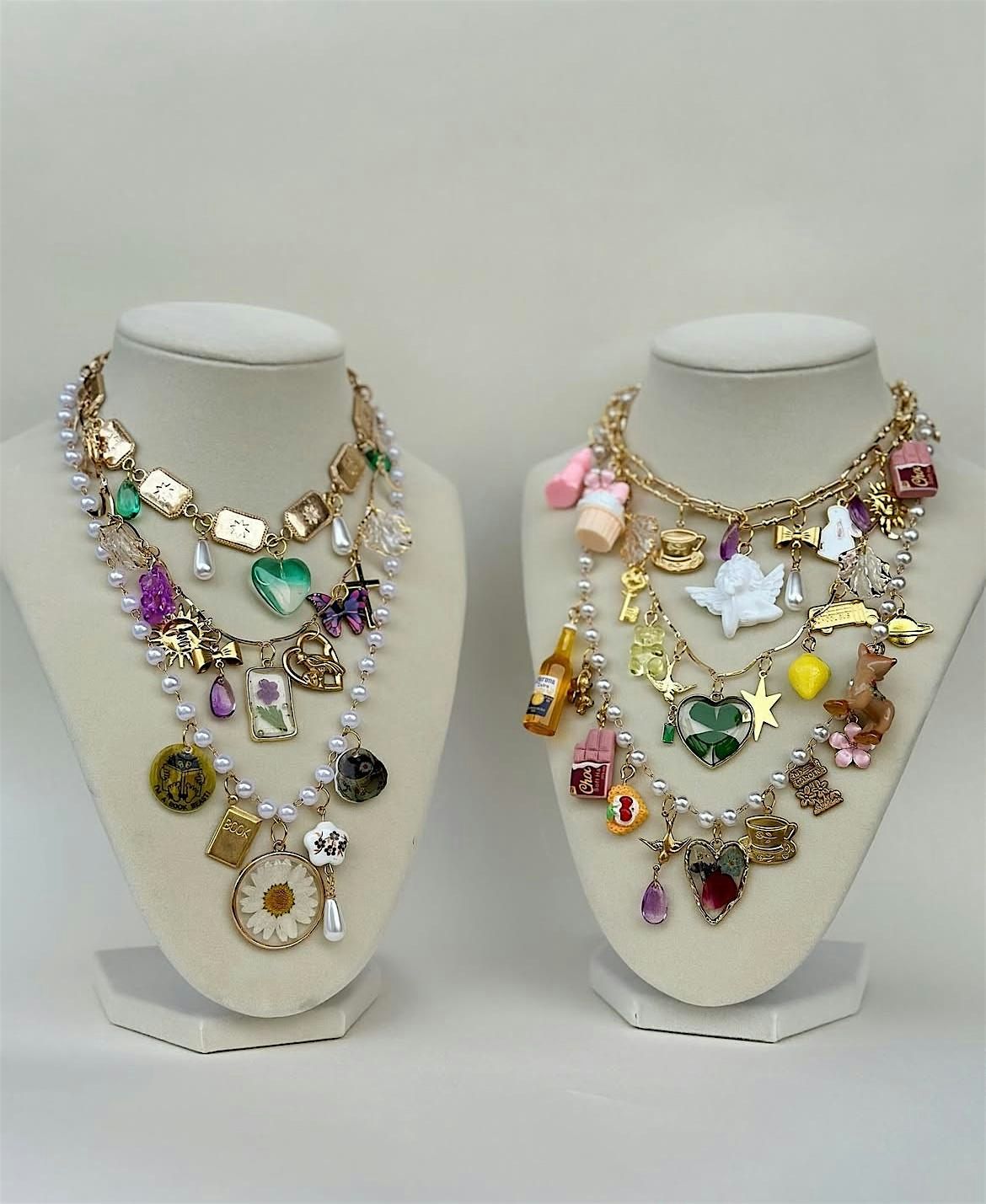 At the charm bar, customers can mix and match vintage, deadstock, and handmade charms to create their own custom necklaces, pins, and more. Once their piece is finished, payment is collected based on the selected charms and final design.