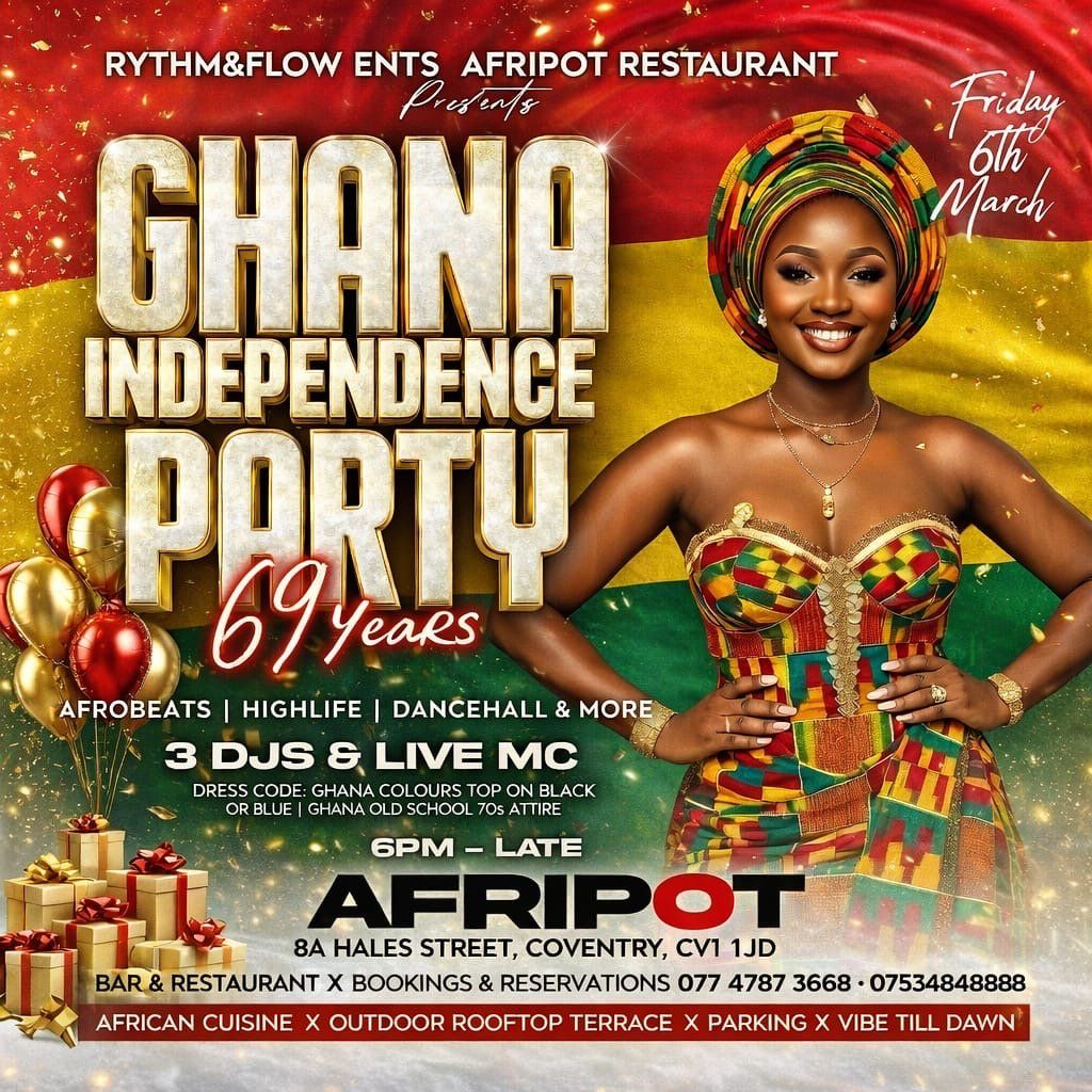 Coventry, it's a Ghana at @69 showdown. Afripot brings two nights of DJs, MCs, rooftop energy, food and culture on 6-7 March. Ghana colours or 70s