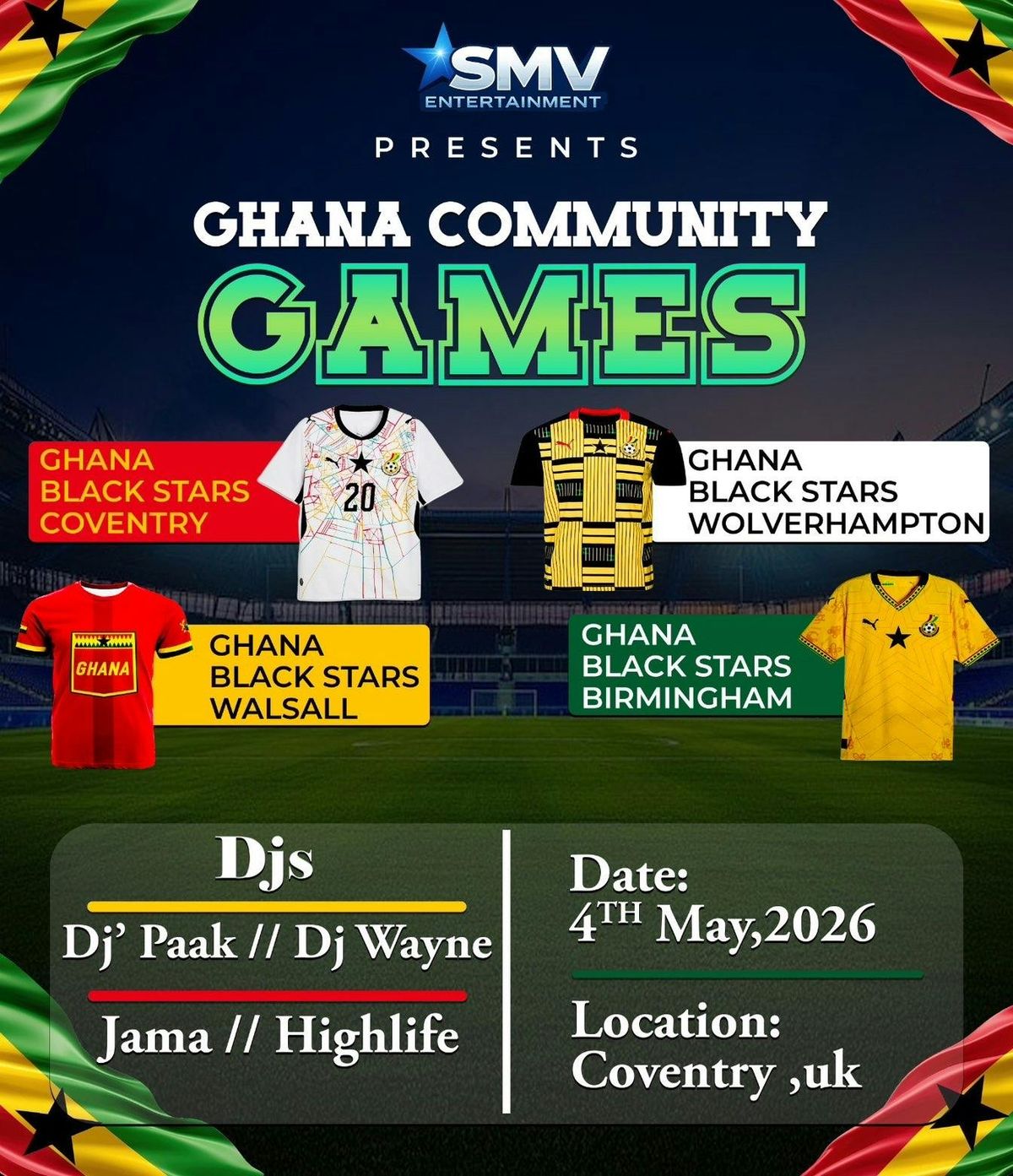 We are excited to invite you to the Ghana Community Games, taking place on 4th May in Coventry.🇬ðŸ‡To support the Ghana community team and help make this event a success, there will be a small entry fee of £3 per ticket. This contribution will go directly towards supporting the team and ensuring everyone can enjoy a well-organised and memorable day.