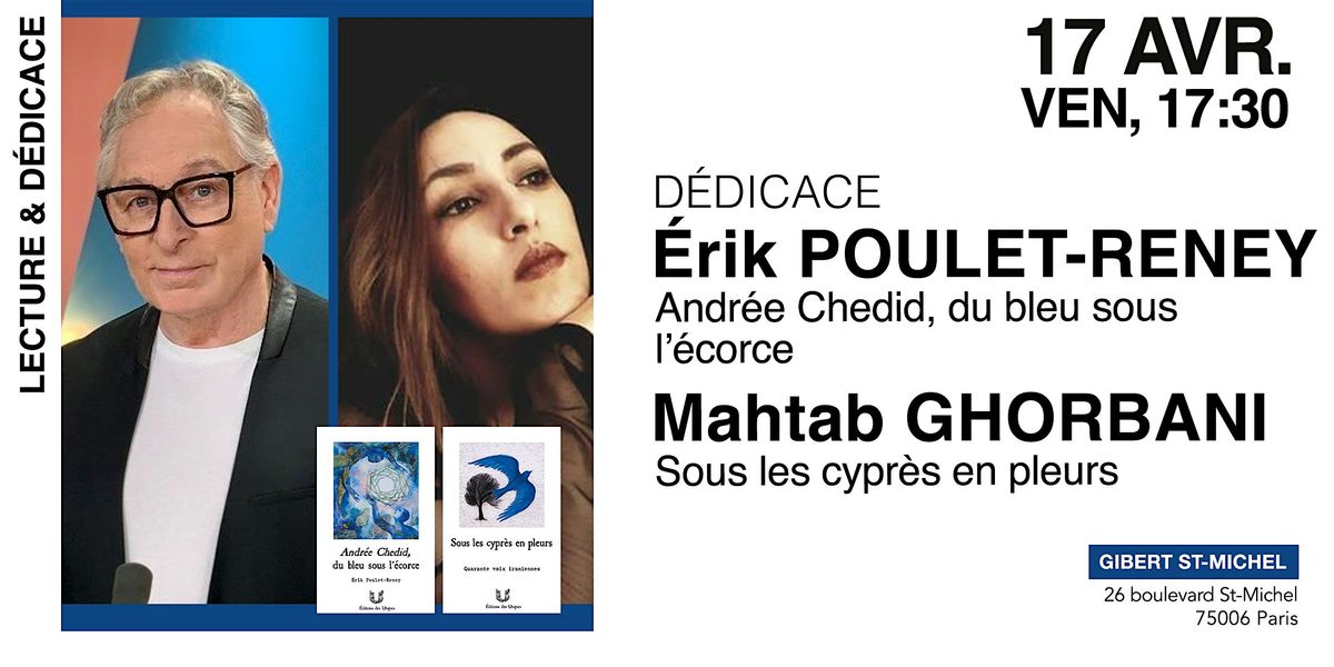 La librairie Gibert et les Éditions des Utopies ont le plaisir de vous convier à une rencontre avec Mahtab Ghorbani, poétesse et militante des droits de l'Homme, Julian Paillassa, éditeur et poète, et Érik Poulet-Reney, écrivain, chroniqueur littéraire et poète. Ce moment d'échange sera l'occasion de présenter aux lecteurs les deux nouveautés publiées en avril par la jeune maison, autour de lectures en français et en persan de l'anthologie de poésie iranienne "Sous les cyprès en pleurs" (cri de résistance de quarante voix contemporaines s'élevant en défense de la vie et de la liberté), et d'extraits de "Andrée Chedid, du bleu sous l'écorce" (hommage sensible et délicat en vers et en prose qu'Erik Poulet-Reney rend à la femme de lettres, son amie et marraine d'écriture).