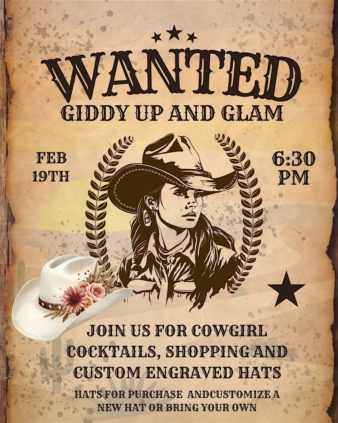 WANTED: All ladies who want a fun night and a new custom hat! Join us for cowgirl cocktails and leave with a personalized hat.