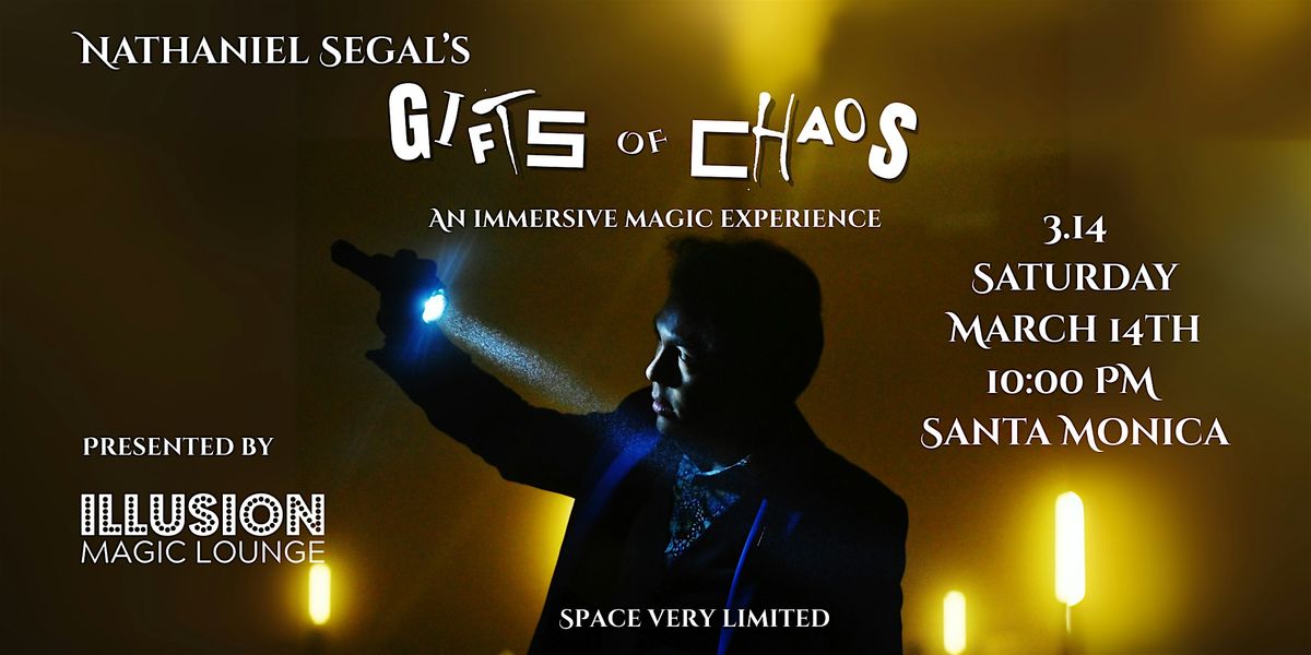 Welcome to the Gifts of Chaos event at Illusion Magic Lounge! Magician and inventor Nathaniel Segal shares some of his strongest original magic in this intimate interactive immersive experience! Set in a unique and unexpected space, this show is limited to only 12 participants. Don't miss out on this one-of-a-kind experience that will challenge your perception of reality. Grab your tickets now and prepare to be amazed!