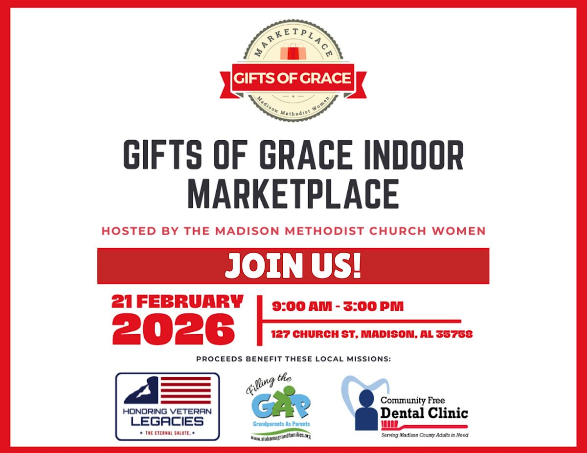 Gifts of Grace Marketplace is set for Saturday, February 21st, 9:00 AM–3:00 PM at Madison Methodist Church. Sponsored by the church’s women’s group, this annual indoor event features local crafters, with all proceeds benefiting local ministries. Enjoy free admission, a variety of vendors, and soup with muffins or brownies at our Charity Café. All vendor spots are filled. For more information on our vendors, visit our Facebook Event page: https://www.facebook.com/share/1WBVPtREfM/