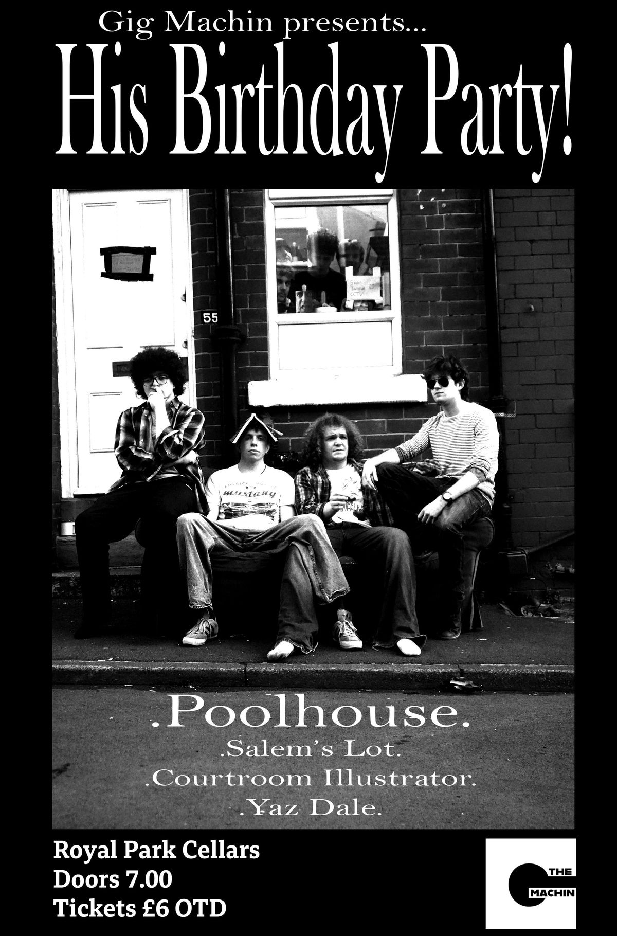 Welcome to Gig Machin's Birthday Party, the party for Gig Lovers!Come see Poolhouse, Salem's Lot, Courtroom Illustrator and Yaz Dale clamber the stage playing sweet tunes right to you!