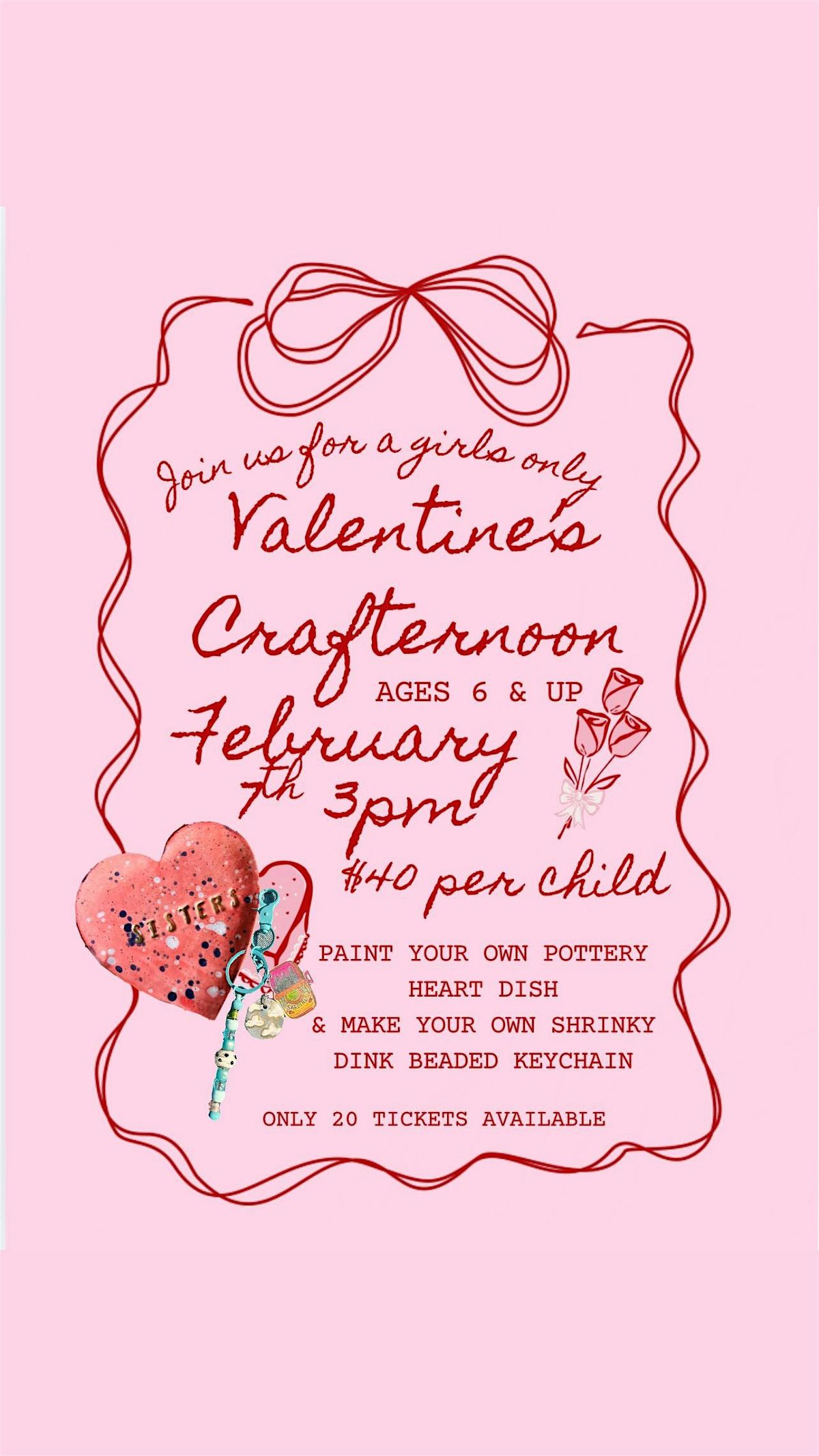 Come join us for a fun-filled afternoon at Petty Betty Art Studio on February 7, 2026 at 3:00 PM (Central Time)! This crafty event is perfect for ages 6 and up and will include 2 different crafts. Artists will paint a pottery heart dish and design a shrinky-dink beaded keychain during this event. The painted pottery piece will be picked up completed on a later date.