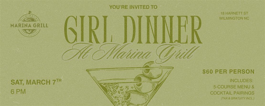 Join us for a chic Girl Dinner at Marina Grill featuring 5 curated courses paired with cocktails. Itβs stylish, shareable, and made for a fun night out with your favorite people.