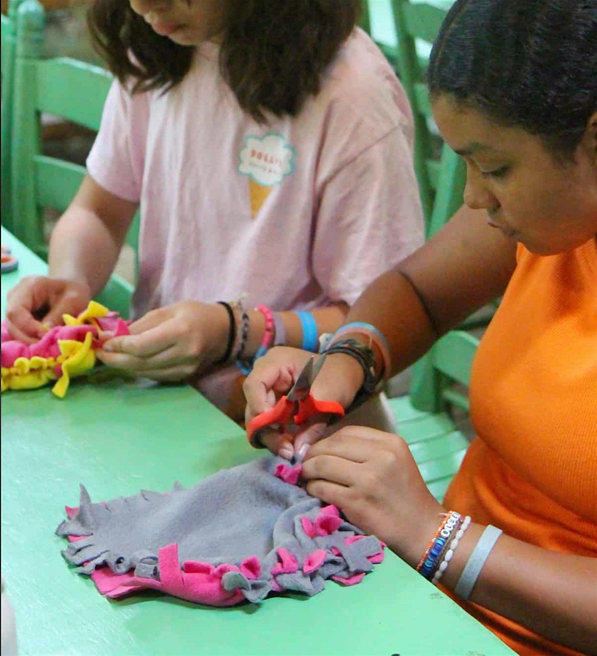 Laura is an experienced teacher AND a proud mom, with a daughter who also loves art and crafting. Here she is working with fabric markers in one of her mom's upcycled fashion classes from summer 2025!