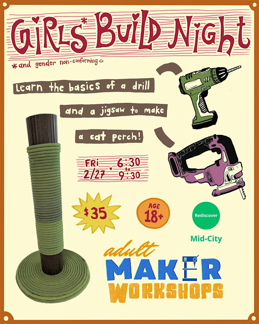 Learn the basics of using a drill and jigsaw in this female-friendly/gender inclusive workshop where we will make a perch for your feline friends! Ideal for people with little to no experience looking for an introduction on how to use these tools. Make a cat perch and maybe a friend at the same time!