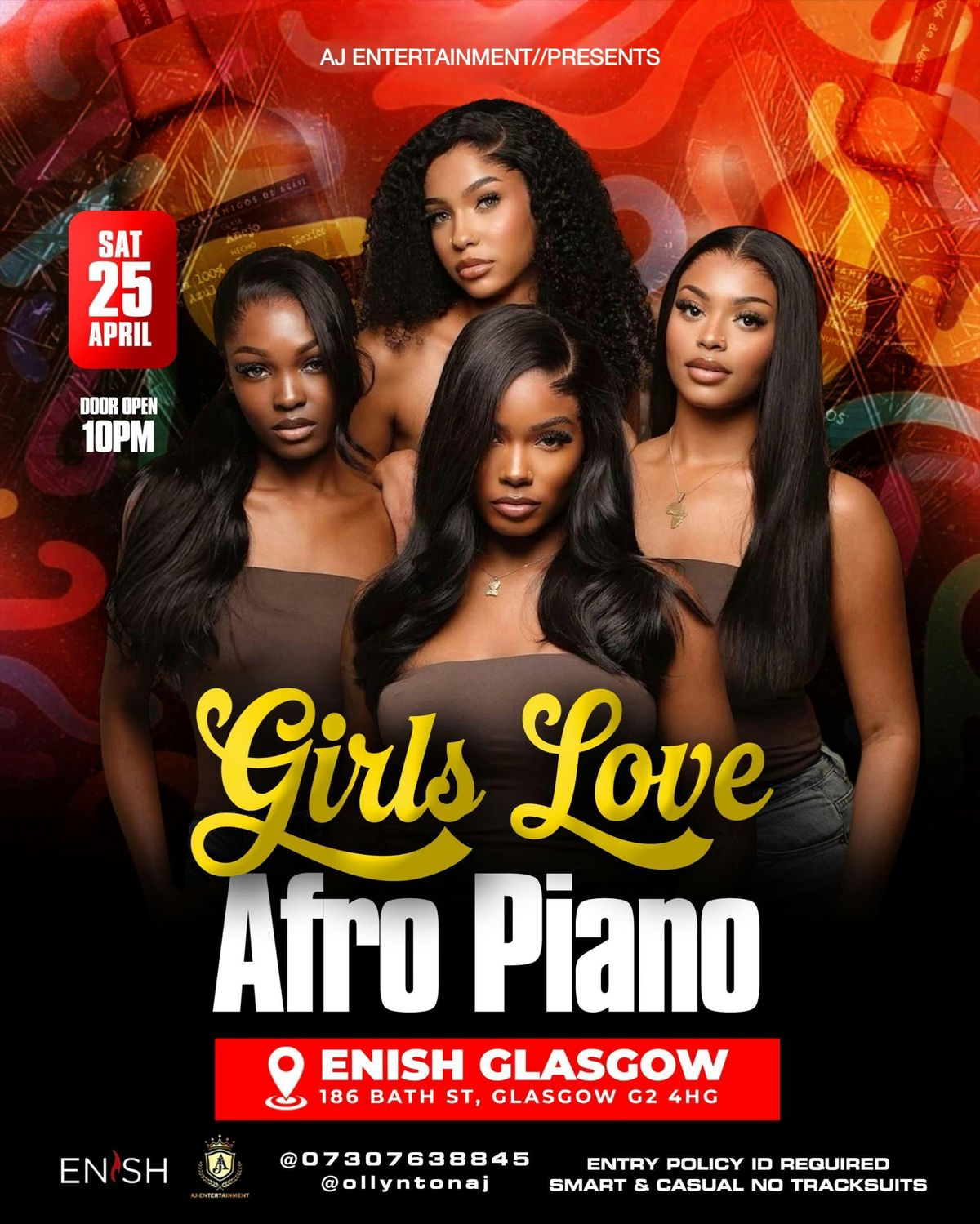 THIS NITE IS SPECIALLY PACKAGE TO MIX THE ENERGY UP A LITTLE BIT. GIVING THE AFRO PIANO VYBZ ALL NITE WITH OUR INVITE DJ FROM EDINBURGH DJ MANNYBEATZ N ALL HIS FRIENDS MAKING SURE U GET THE GOOD VYBE IN THE BUILDING SO JOIN US 25TH OF APRIL N LETS TAKE OVER THE DANCE FLOOR WITH HIGH ENERGY. ITS AFRO PIANO NITE IN GLASGOW