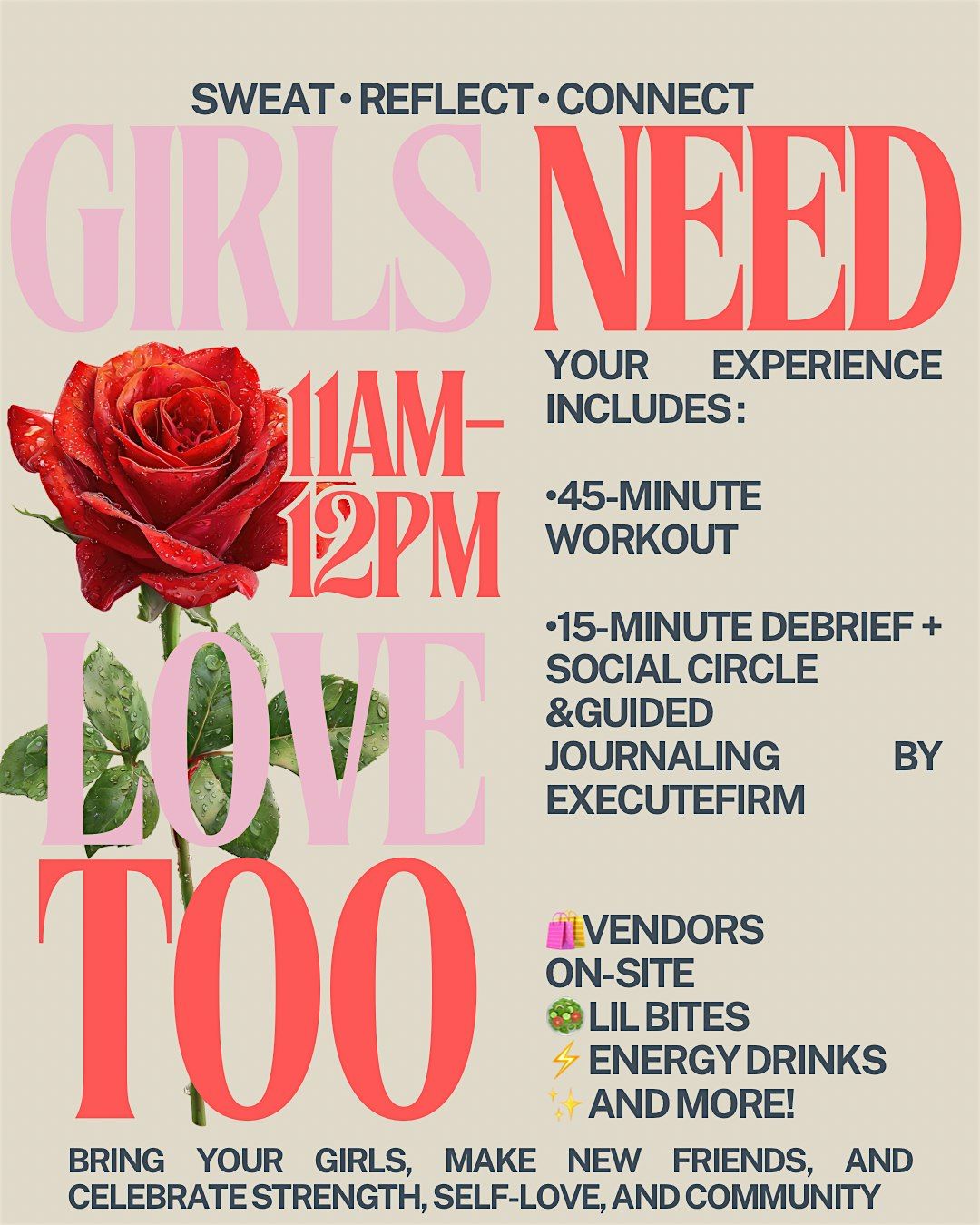 GIRLS NEED LOVE TOO is a Galentine’s wellness experience designed for women who love to move with intention and rest without guilt .