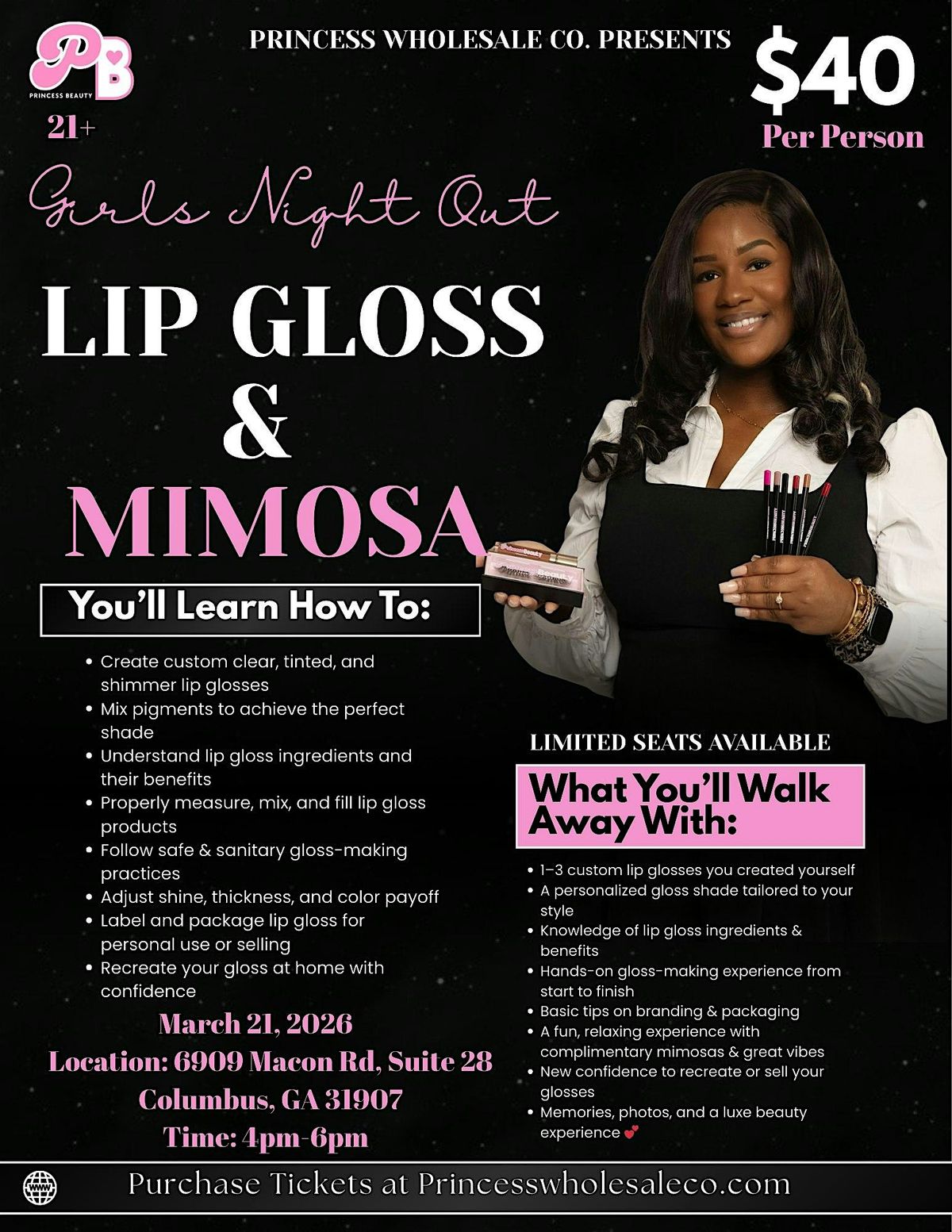 Join Princess Beauty Lab by Princess Wholesale for our Lip Gloss & Mimosas Class, where you’ll learn how to create your own custom lip gloss shades while enjoying refreshing mimosas (non-alcoholic options available).