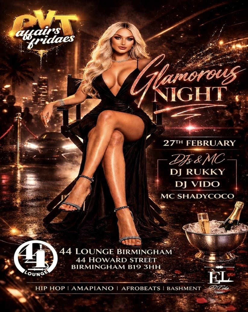 ✨ GLAMOROUS NIGHT – 27th February at 44 Lounge Birmingham ✨Get ready for a night of pure luxury, elite vibes, and unforgettable energy. Join Birmingham’s finest crowd for an exclusive experience filled with champagne, style, and nonstop music.