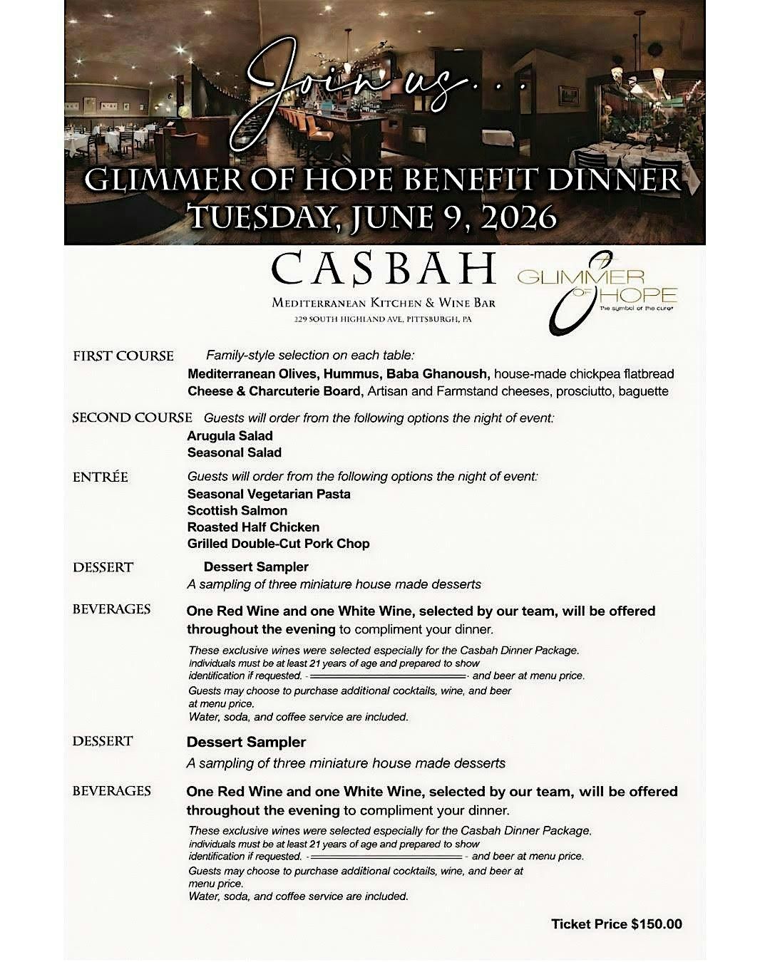 One Red Wine and one White Wine, selected by our team, will be offered throughout the evening to compliment your dinner. These selected wines are included in the Benefit Dinner Package.