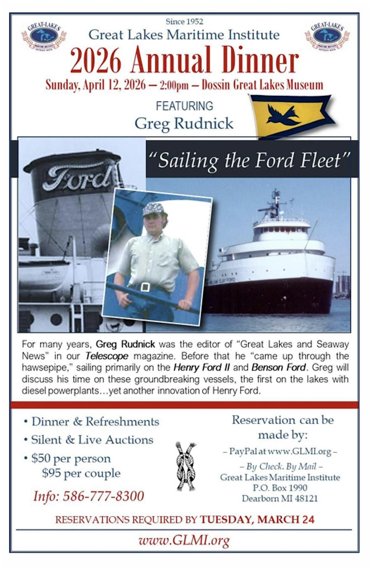 Dinner, Speaker Greg Rudnick and refreshments. Don’t miss the annual dinner and this engaging presentation. $50 pp or $95/ couple.