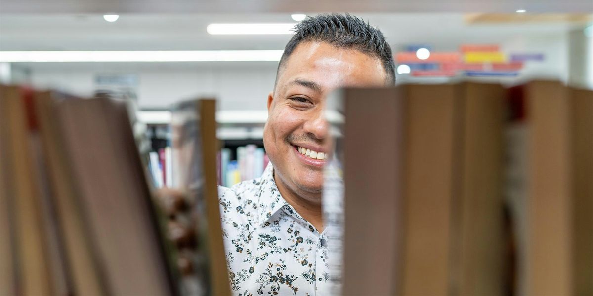 Image: A smiling person glimpsed through books on a library shelf reaches for a book.