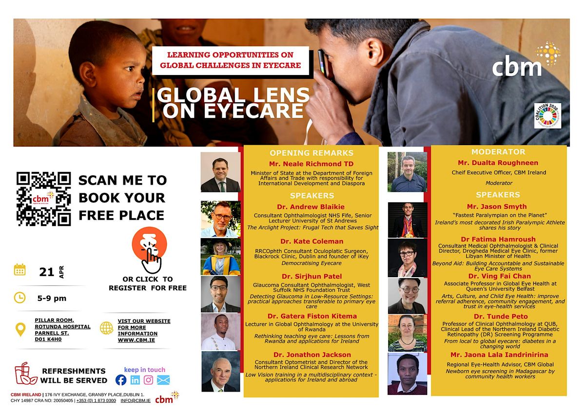Speakers will include ophthalmologists, optometrists and ophthalmic nurses practicing and teaching in Ireland, the UK, Madagascar and more whose work transcends economic and developmental divides. Dr. Andrew Blaikie (founder of the Arclight Project, University of St Andrews), Dr Tunde Peto (Queen’s University Belfast), Dr Sirjhun Patel (West Suffolk NHS Foundation Trust), Dr. Kate Coleman (Ophthalmic Surgeon & Founder of iKey), , Dr Gatera Fistom Kitema (University of Rwanda), Dr. Fatima Hamroush (Consultant Medical Ophthalmologist and former Libyan Minister of Health), Jaona Lala Iandrinirina (CBM Global Regional Eye Health Advisor), Dr. Jonathon Jackson (Consultant Optometrist and Director of the Northern Ireland Clinical Research Network) and Dr. Ving Fai Chan (Queen’s University Belfast). Special guest speaker, Mr. Jason Smyth, Ireland's fastest paralympian.