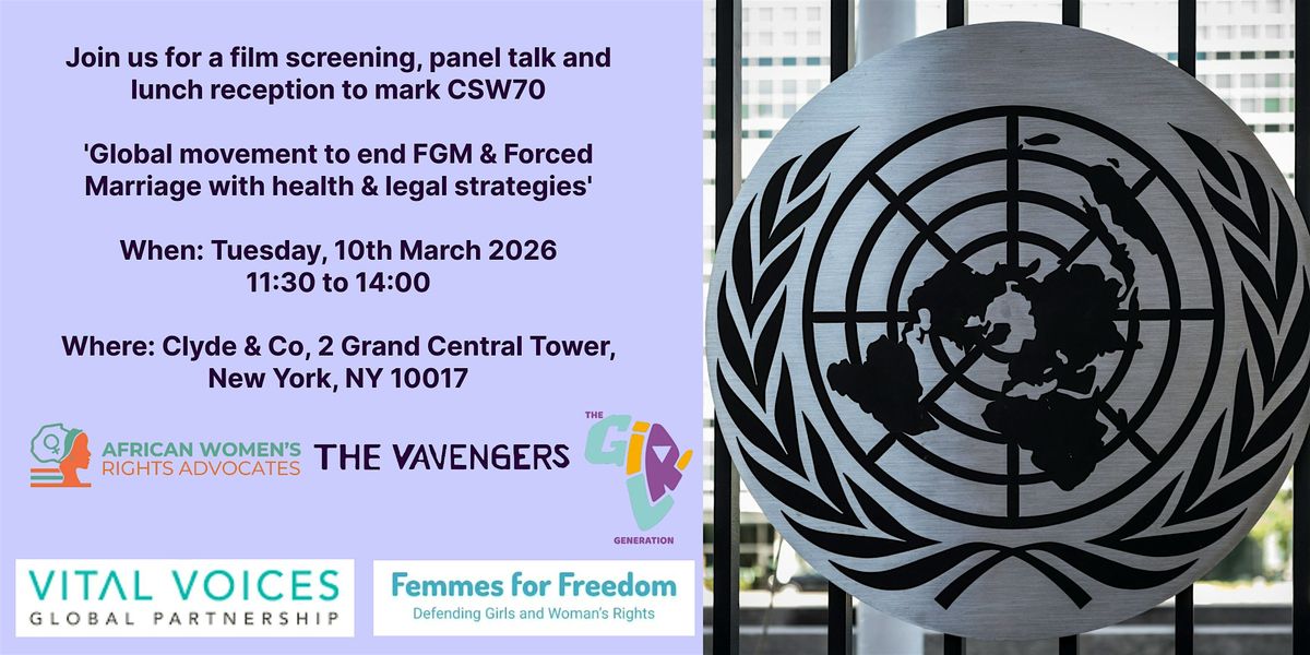 You will hear from expert leaders from The Vavengers, African Women's Rights Advocates, Vital Voices, Femmes for Freedom, The Girl Generation, and more on what health & legal strategies are being used to end Gender-Based violence globally.