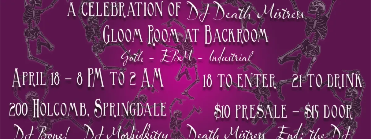 It's DJ Death Mistress's Birthday! So come out for an Elder Goth Night!We're celebrating Gloom Collective co-founder DJ Death Mistress with a night of old school goth and industrial, so bring your stompy boots.Featuring:DJ Morbidkitty (Austin)DJ Bone! (OKC)DJ Death MistressEnd: the DJ