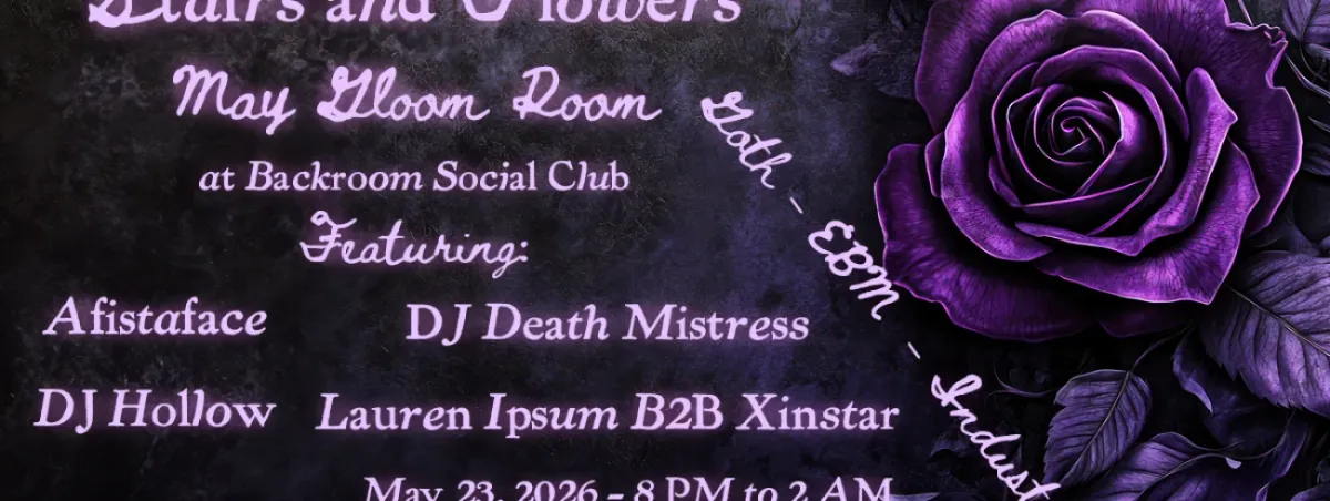 Even the flowers are ugly...It's the May Gloom Room at Backroom! Come dance to some hard-hitting beats and goth classics with:AfistafaceDJ HollowDJ Death MistressLauren Ipsum B2B Xinstar